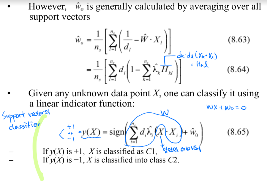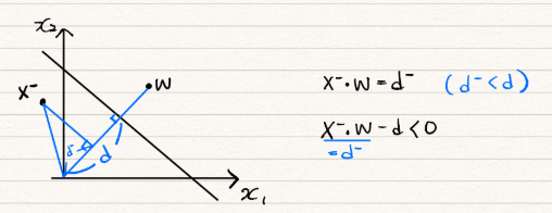 - unknown 데이터(X)를 넣어서 [X·W-d] 값이 음수이면 X는 W벡터와 반대쪽 클래스로 판단.