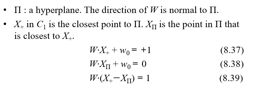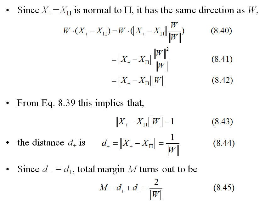 - 주어진 hyperplane과 같은 법선벡터를 가지면서 $X^+$를 지나는 초평면은 w·x-b = +1으로 나타낼 수 있다. $X^-$를 지나는 초평면은 w·x-b = -1으로 나타낼 수 있다.
