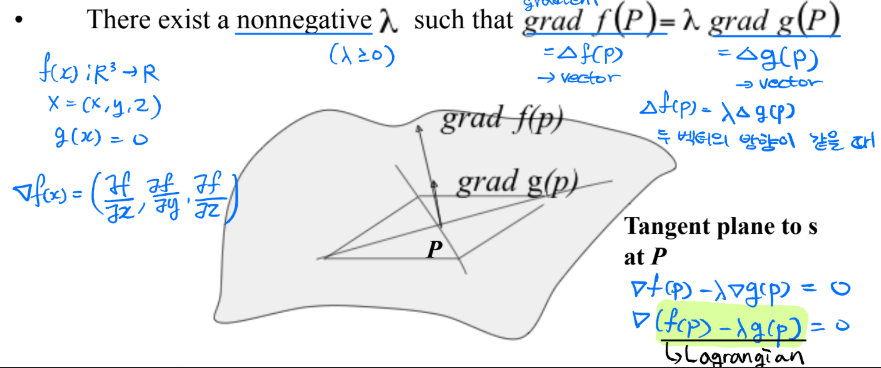 - g(x)=0 표면 위에 모든 점 중에서 f(P) 값이 최대 혹은 최소가 되는 점을 찾아라.
