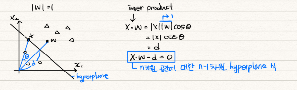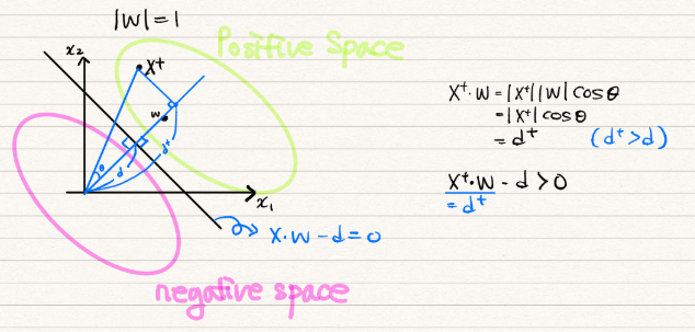 - 양수이면 X는 W 벡터와 동일한 쪽 클래스로 판단.
