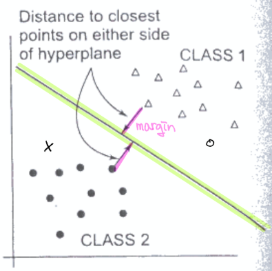 - margin: hyperplane과 가장 가까운 곳에 위치한 데이터와의 거리