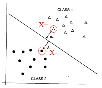 - $X^+$: $y_i$ = +1의 데이터 중에서 hyperplane과 가장 가까운 데이터 (support vector)